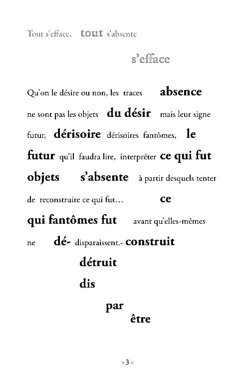 Afin de rendre palpable le trouble lié au processus à l’œuvre dans la perte de mémoire, qui n’est pas simple effacement, mais mouvements semblable aux déplacements de terrains – glissements, effondrements de cavités, éboulements, chutes de blocs rocheux, coulées de boue… par lesquels la géographie d’un lieu se transforme – la mise en forme du texte joue sur plusieurs plans: la réflexion (en caractères maigres) suit un fil continu, interrompu par des insertions de fragments du texte, en caractères gras qui, par condensation, inversion, déplacement, perturbent la réflexion initiale, constituant un deuxième texte – les deux superposés formant le troublant portrait d’une mémoire qui défaille.
