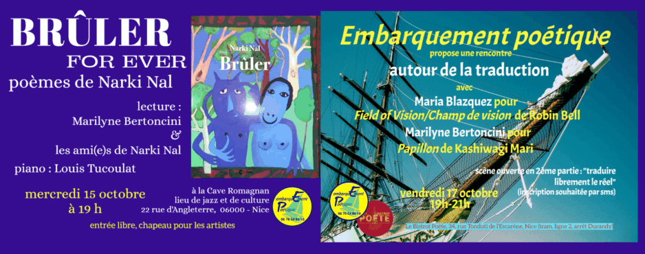 . Le 15 octobre, c’est à la Cave Romagnan, lieu de musique et de culture bien connu à Nice, notamment des amateurs de jazz, que nous rendrons hommage à l’amie Narki Nal, qui fit partie de nos lecteurs, et qui nous a quittés il y a 3 ans après nous avoir confié les poèmes formant son recueil, Brûler, publié par Marilyne Bertoncini aux éditions Oxybia. . La soirée commence à.. Read More