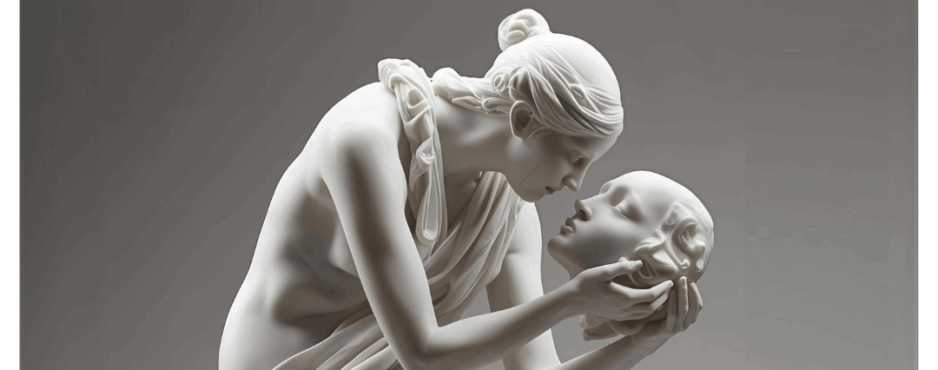 illustration réalisée avec IA . MUSÉE D’ORSAY: RANDOM NOTES III x How fitting! A pair of lovers anatomize a kiss Before marble Shaped into the Muse Kissing Orpheus, Now only a head. x A severed head is a reed Without stops. The throat, hollow Like a marrow bridge now broken, Cannot grasp the heart Where all air is bent into sound. A kiss is a sound lost in this dark… Read More