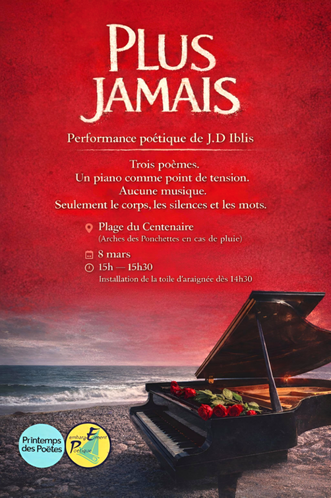 Intitulée « Plus jamais, « , la performance poétique de J.D Iblis est construite autour d’un piano comme point de tension.